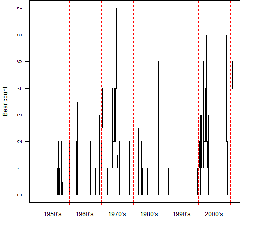 Four different smoothing windows were used: quarter-year, half-year, year, 4 years. Each of these were used with standard estimation and robust estimation. We don’t know which of these is best. But for each point in time we can plot how many of these 8 thought a bear market was on.