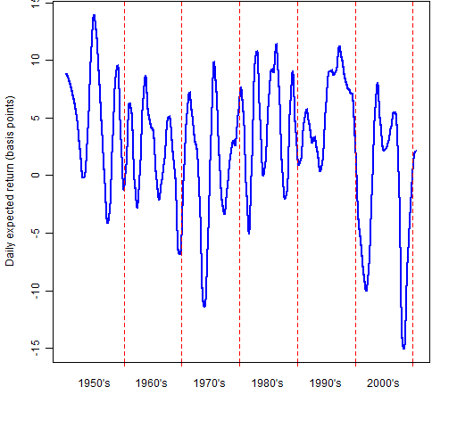 While we’d really like to estimate the expected return at each point in time, finding bear markets is ambitious enough. The plan starts by smoothing the daily returns through time, as in Figure 1.