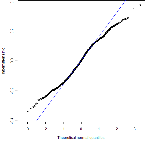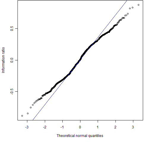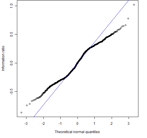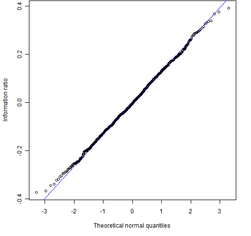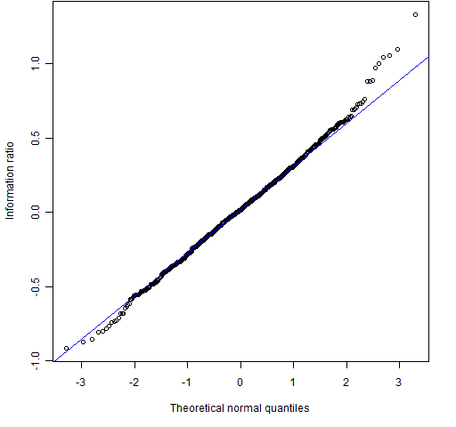 The “reasonable” return distribution results in a distribution for the information ratio that is very close to normal.  So you might ask what the advantage is of the bootstrap over traditional methods.  One answer is that the bootstrap is probably better than analytic methods at handling whatever distortions there are from normality.  Also with the bootstrap you don’t have to think — you only need to be able to write a for loop in R.  That is, you can apply Uwe’s Maxim.