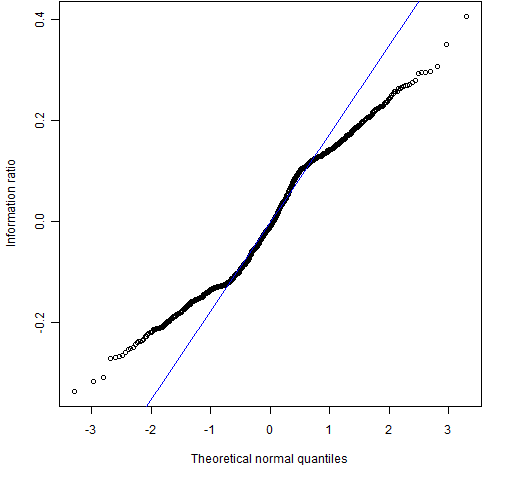 Returns were simulated and the information ratio for the returns was computed.  The number of returns used was either 12 (as in a year of monthly data) or 60 (as in a quarter of daily data).  The distribution of the information ratios is plotted using a normal qqplot.  The lines in the plots show the behavior of the extreme quartiles relative to the middle quartiles.