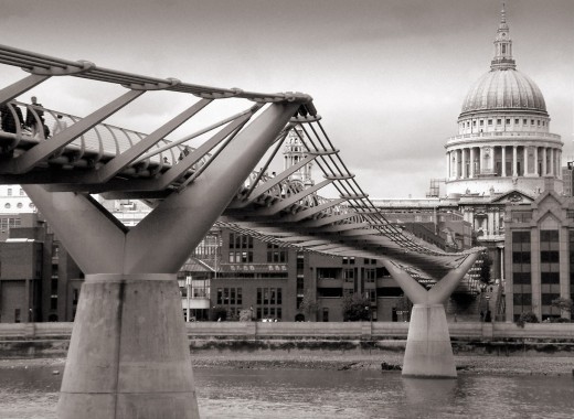 Figure 5: The wobbly bridge (via Wikipedia). Fixing the problem with the wobbly bridge was, in theory at least, a simple task.  Damping the motion simply required that sufficiently powerful shock absorbers were anchored between points on the structure