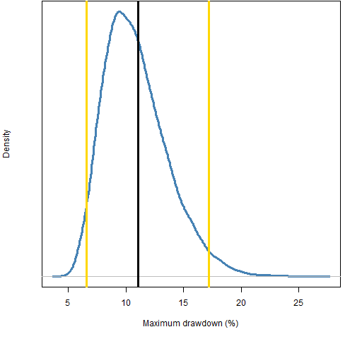 Figure 2: Distribution of maximum drawdown from permutations of the portfolio returns, with 95% confidence interval (gold lines).