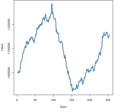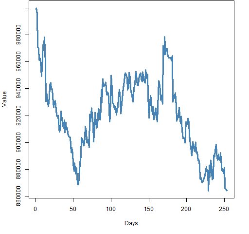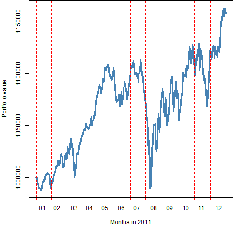 In the post “A minimum variance portfolio in 2011” we explored a particular portfolio. Figure 1 shows its value through 2011. We’ll use this as our example.