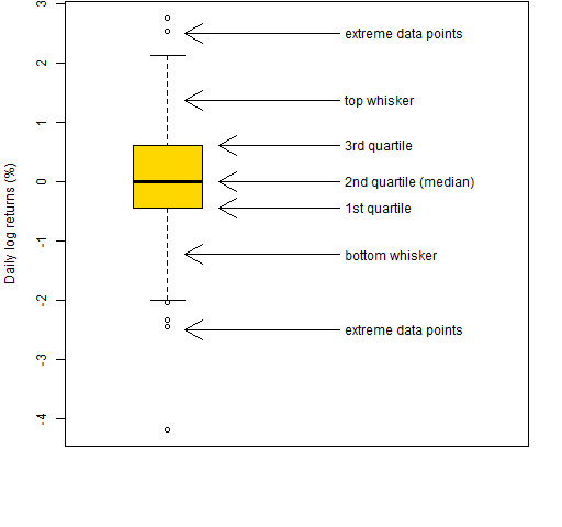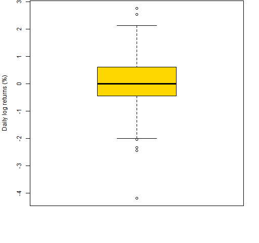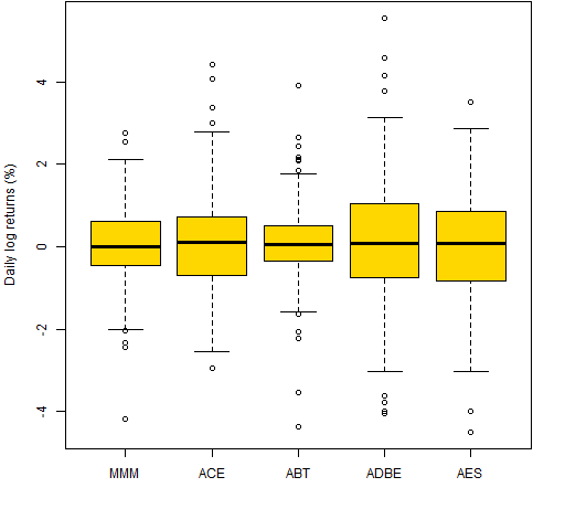 Figure 1 is an example boxplot — it shows the daily log returns during 2012 (so far) for a particular stock (MMM).