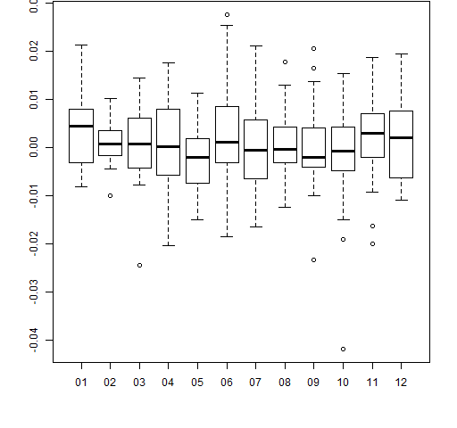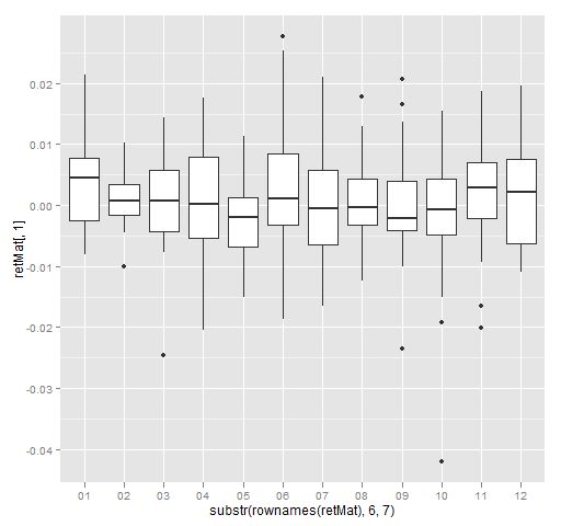 Here we use the first column of the return matrix as the values part of the formula, and extract the month of the year (2012) from the row names to use as the groups. Hence we have a separate boxplot for each month of 2012. The result is Figure 5.