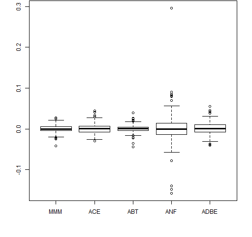 boxplot(data.frame(retMat[,1:5])) # Figure 4