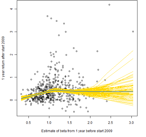 Figure 1: Returns versus beta estimate at start 2009. betaret_start_2009This picture is not especially atypical, and it makes clear that the low volatility anomaly would be better called  the high volatility anomaly.