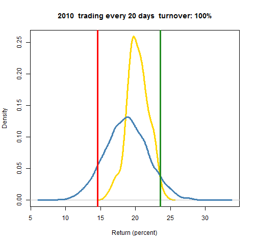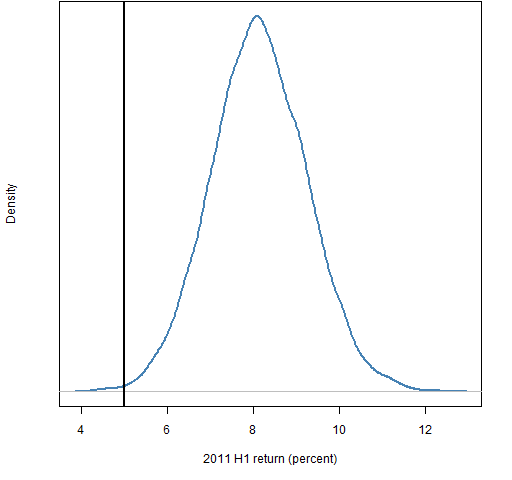 The picture is an example of random portfolios in action to assess performance. The red line is the fund return during the year. It is in the left tail of the distributions, so an indication that the fund underperformed during the year. But there is much more information represented — you can learn what it is from: